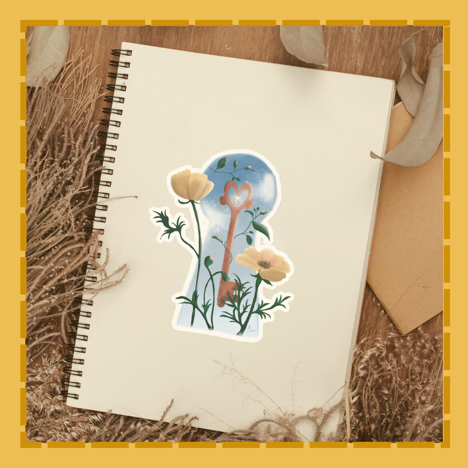 This enchanting vintage skeleton key sticker, hand-drawn by my youngest son, features coral-pink hues with cream florals. Perfect for mystery lovers to decorate laptops, journals, or any surface. Brings cozy mystery charm wherever you place it.